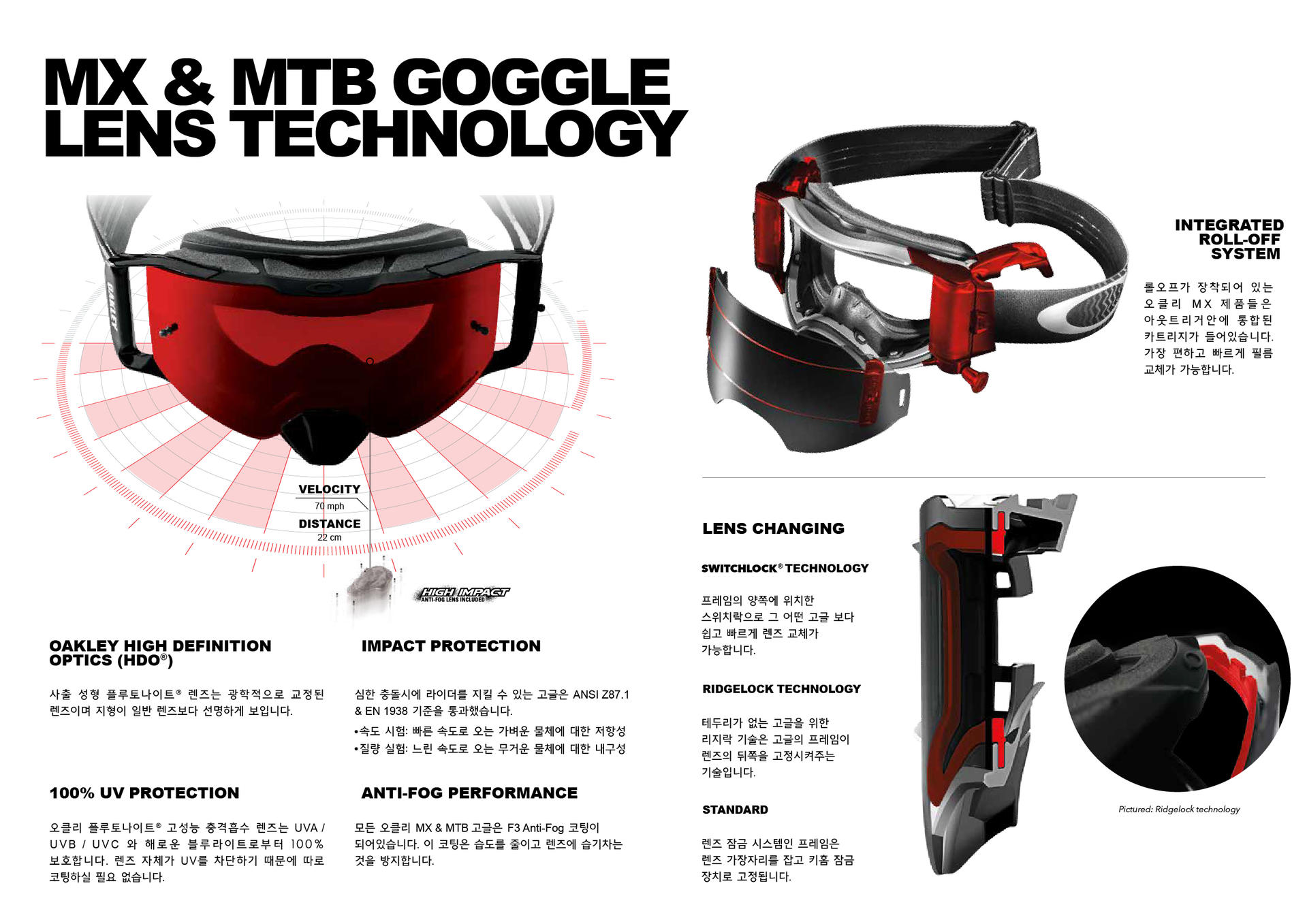 오클리의 순수 플루토나이트™ (Plutonite™) 렌즈는 최고의 충격방지 성능을 갖추었습니다. 최고의 안정성을 보장하는 플루토나이트 렌즈는 에어브레이크의 가장 큰 장점인 오클리 스위치락 (Switchlock™) 기술로 현존하는 고글중에서 가장 쉽고 빠르게 렌즈를 교체하실 수 있습니다. 넓은 시야와 라이더의 얼굴에 편하게 앉는 오클리 에어브레이크는 최고의 프리미엄 고글입니다.